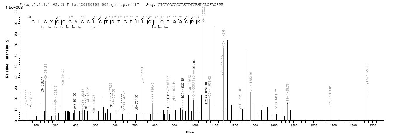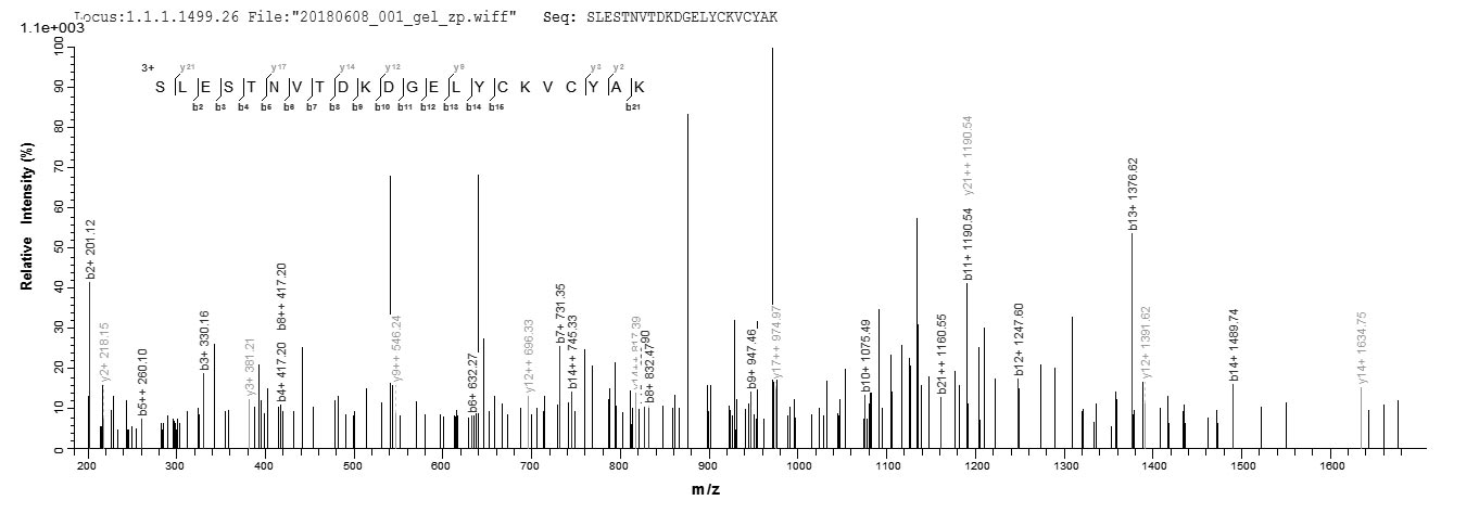 Based on the SEQUEST from database of E.coli host and target protein, the LC-MS/MS Analysis result of CSB-EP006087HU could indicate that this peptide derived from E.coli-expressed Homo sapiens (Human) CSRP3.