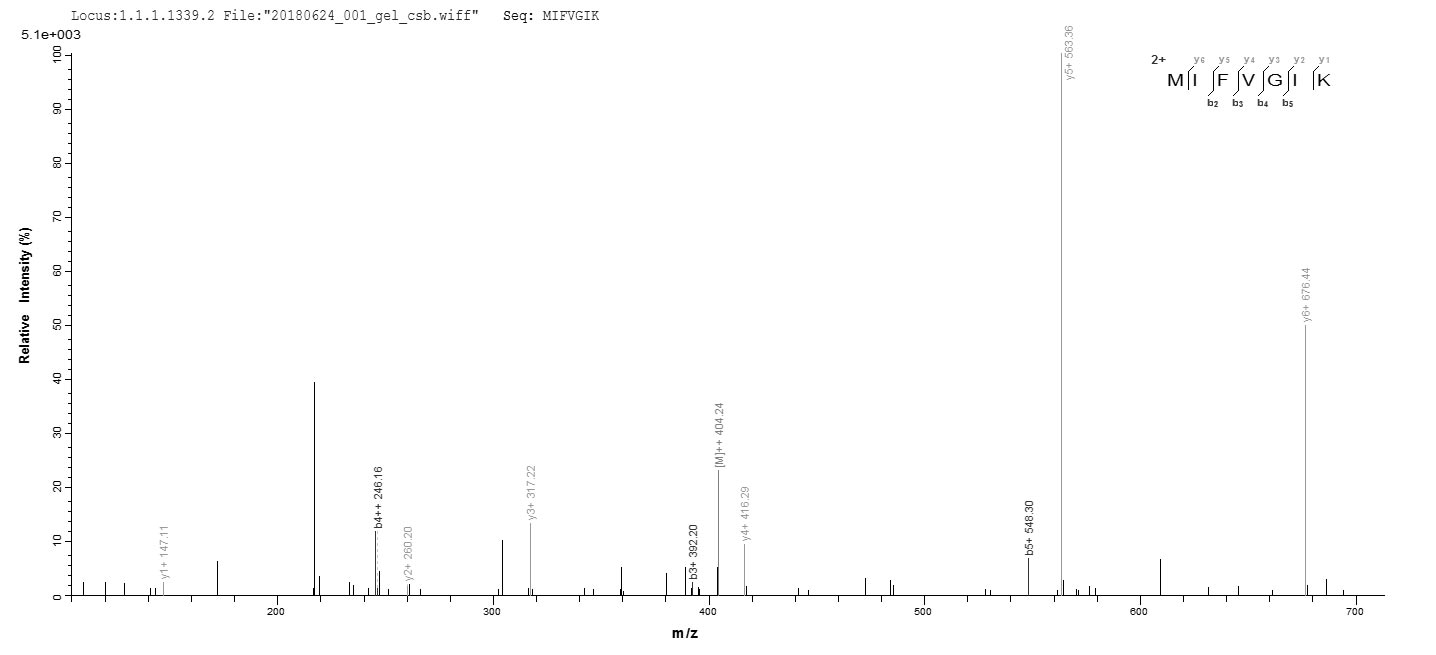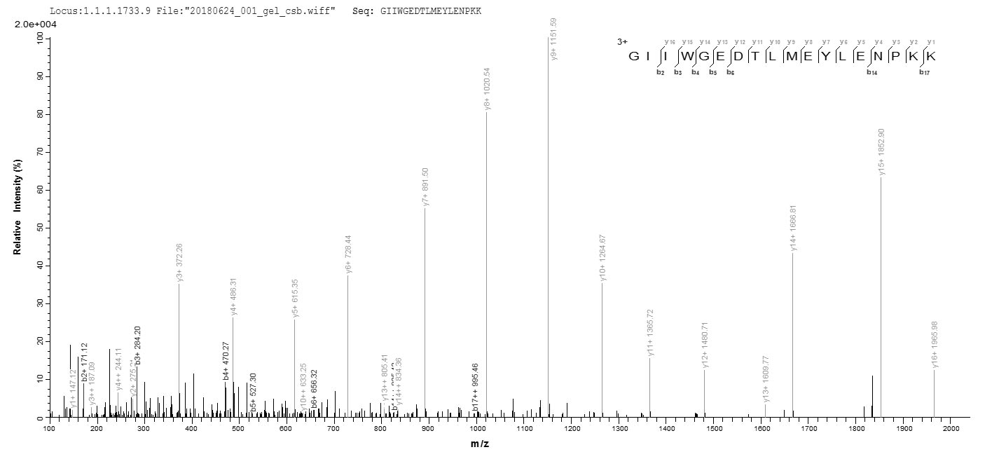 Based on the SEQUEST from database of E.coli host and target protein, the LC-MS/MS Analysis result of CSB-EP006328HU could indicate that this peptide derived from E.coli-expressed Homo sapiens (Human) CYCS.
