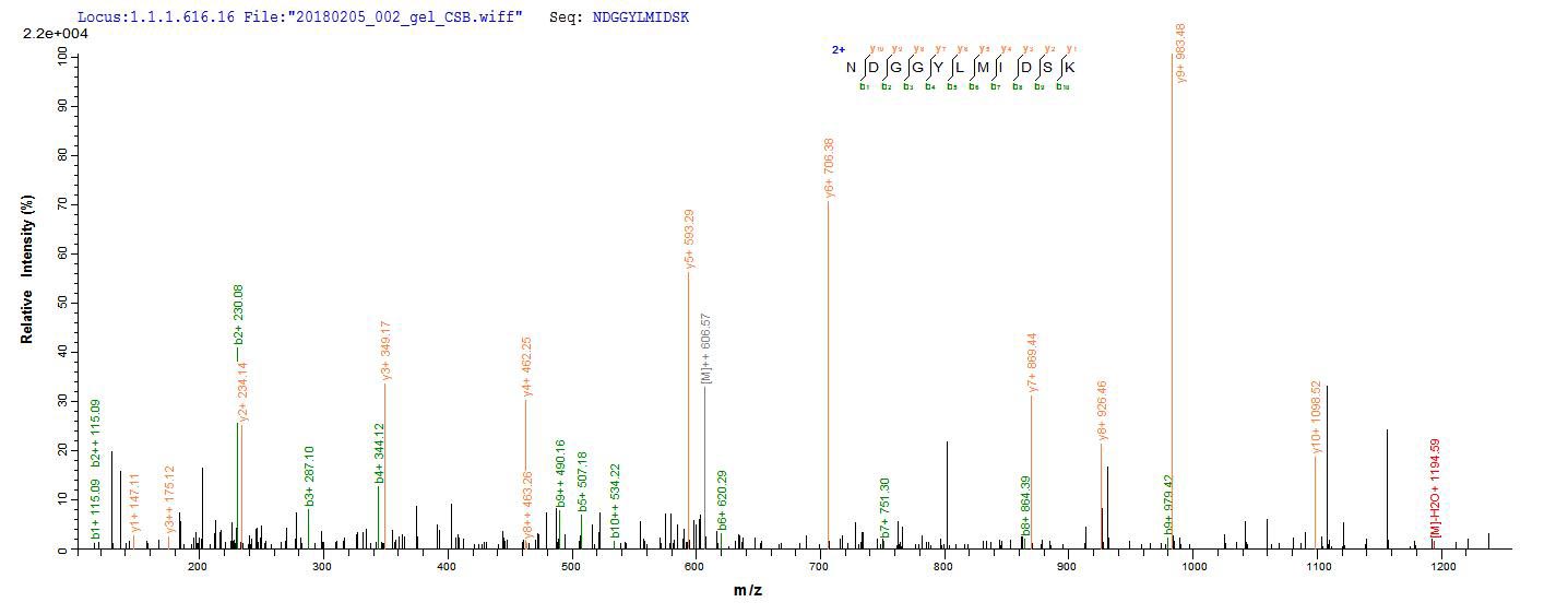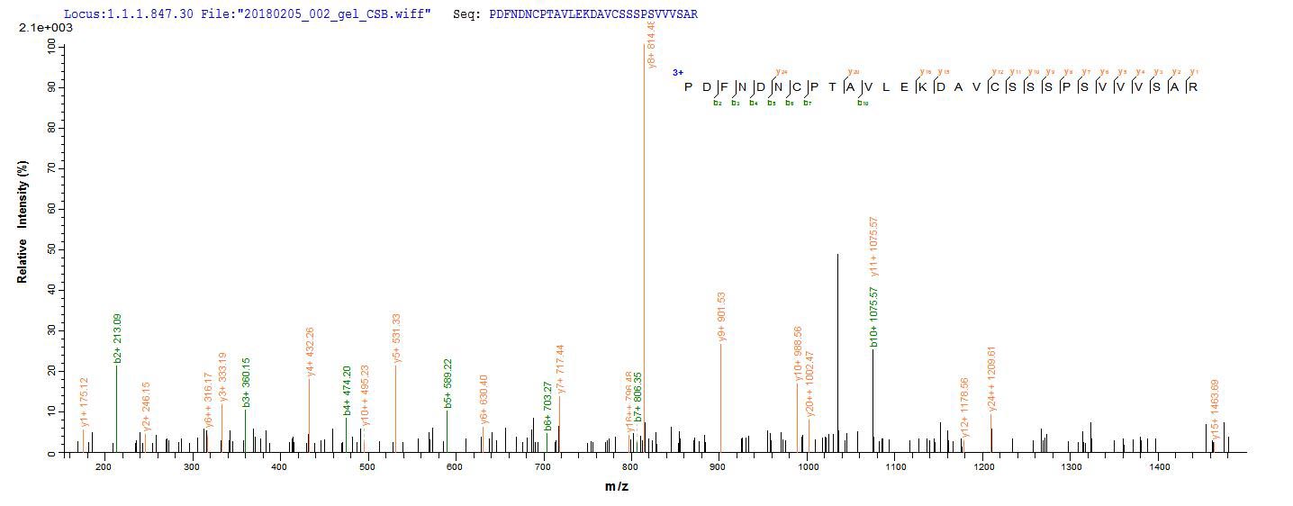Based on the SEQUEST from database of E.coli host and target protein, the LC-MS/MS Analysis result of CSB-EP007205HU could indicate that this peptide derived from E.coli-expressed Homo sapiens (Human) DSG3.