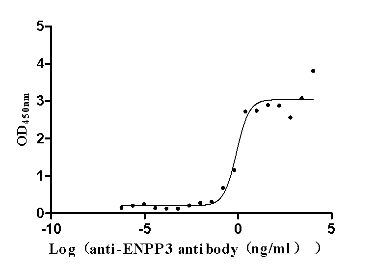 Measured by its binding ability in a functional ELISA. Immobilized Human ENPP3 at 2 μg/ml can bind Anti-ENPP3 recombinant antibody (CSB-RA007681MA1HU), the EC50 is 0.5355-1.248 ng/mL. Biological Activity Assay