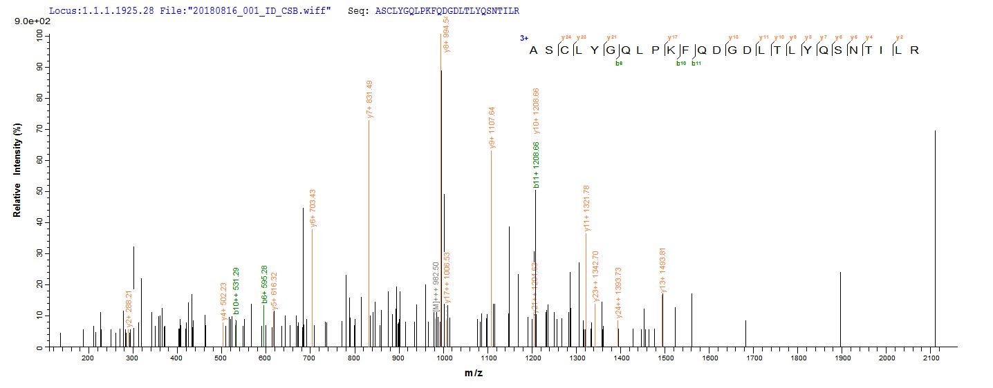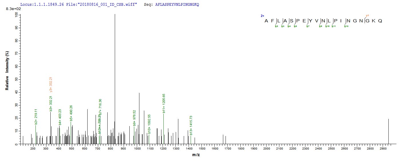 Based on the SEQUEST from database of E.coli host and target protein, the LC-MS/MS Analysis result of CSB-EP009989HUe0 could indicate that this peptide derived from E.coli-expressed Homo sapiens (Human) GSTP1.