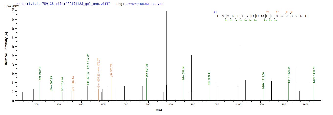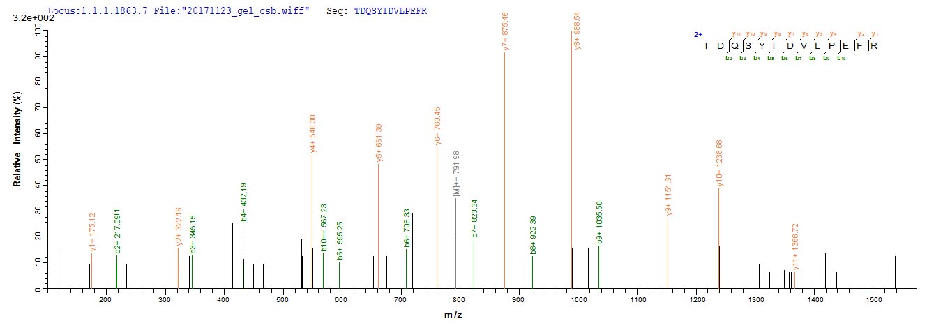 Based on the SEQUEST from database of E.coli host and target protein, the LC-MS/MS Analysis result of CSB-EP013714HU(M) could indicate that this peptide derived from E.coli-expressed Homo sapiens (Human) MET.