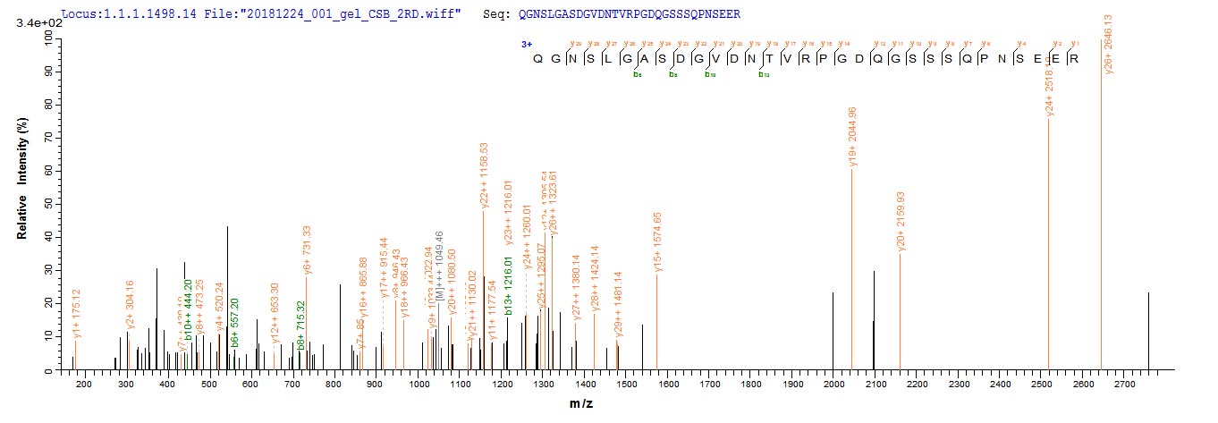 Based on the SEQUEST from database of E.coli host and target protein, the LC-MS/MS Analysis result of CSB-EP010467HU could indicate that this peptide derived from E.coli-expressed Homo sapiens (Human) HJURP.