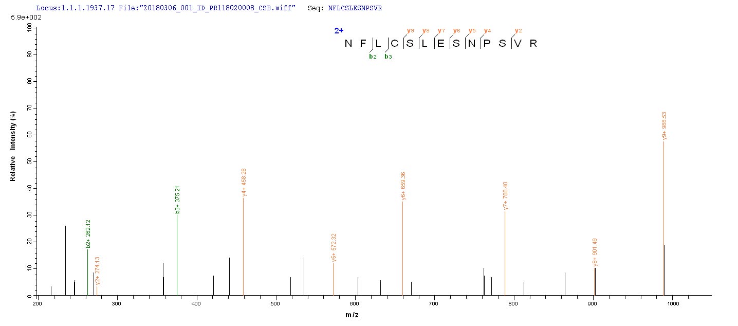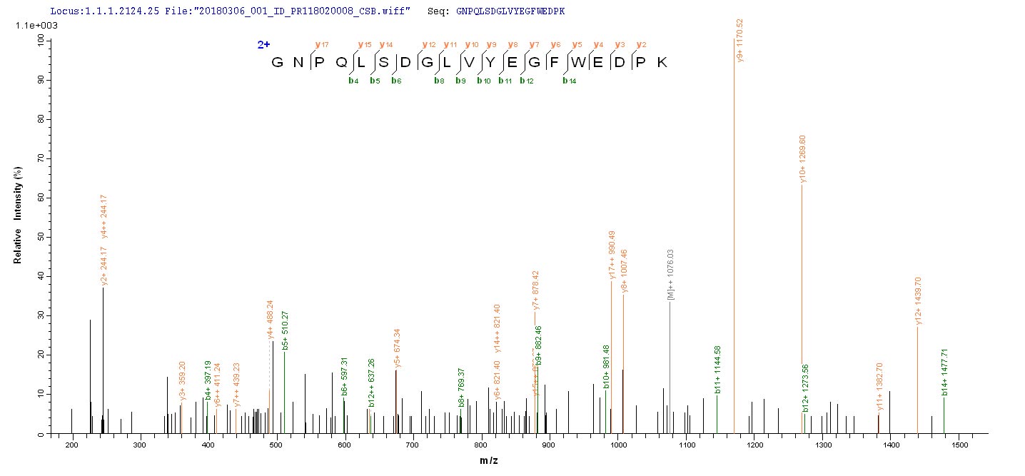Based on the SEQUEST from database of Yeast host and target protein, the LC-MS/MS Analysis result of CSB-YP010996HU could indicate that this peptide derived from Yeast-expressed Homo sapiens (Human) IDO1.