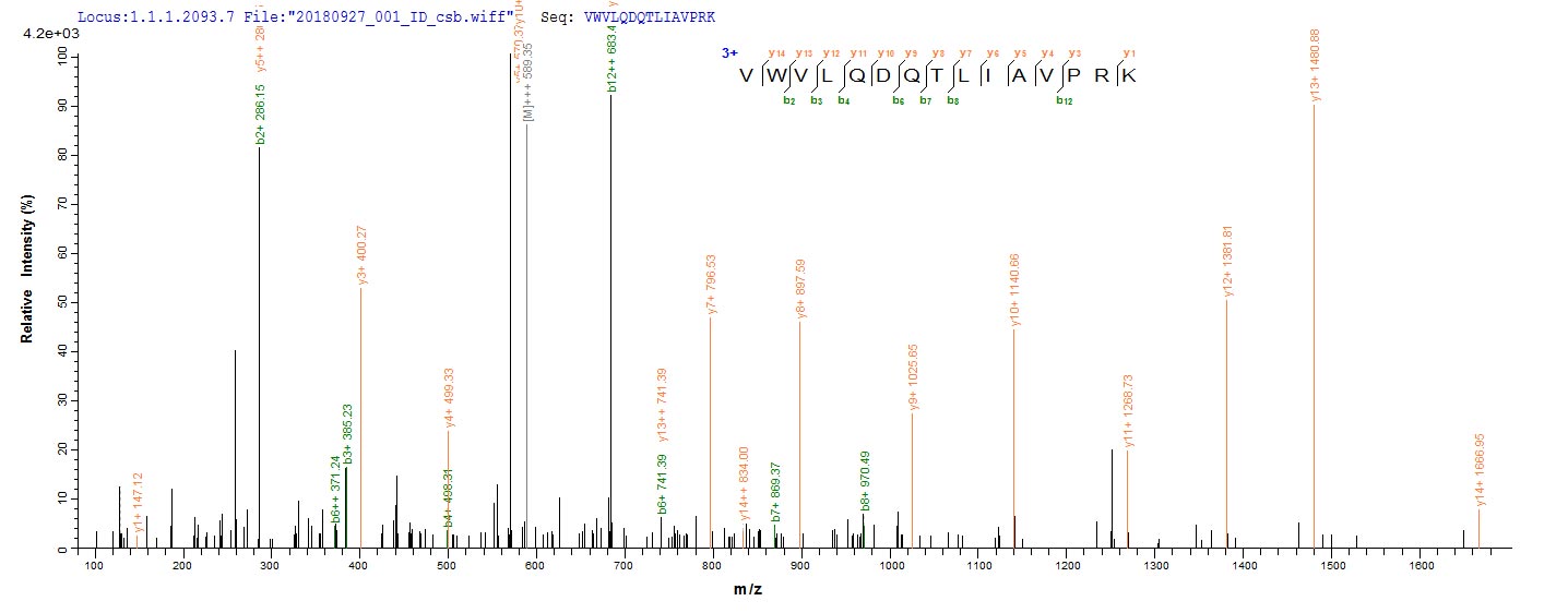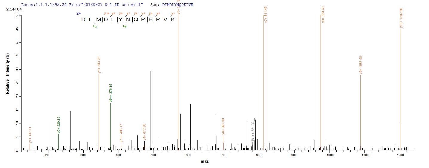 Based on the SEQUEST from database of E.coli host and target protein, the LC-MS/MS Analysis result of CSB-EP887028HU could indicate that this peptide derived from E.coli-expressed Homo sapiens (Human) IL36A.