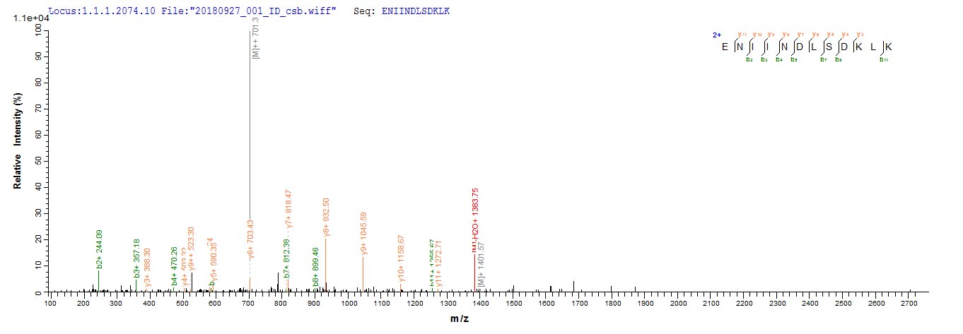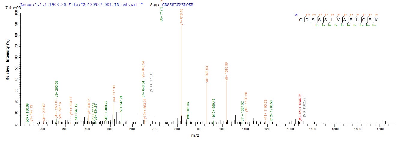 Based on the SEQUEST from database of E.coli host and target protein, the LC-MS/MS Analysis result of CSB-EP855061HU1 could indicate that this peptide derived from E.coli-expressed Homo sapiens (Human) RB1CC1.