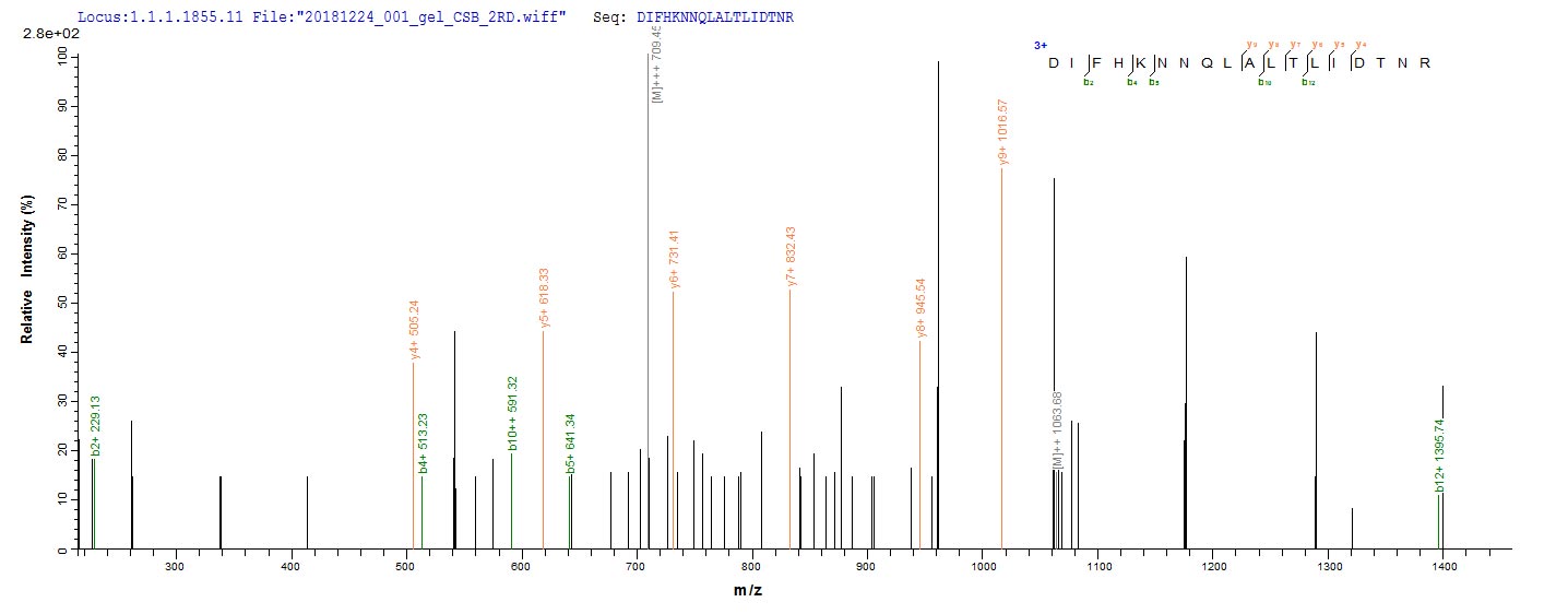 Based on the SEQUEST from database of E.coli host and target protein, the LC-MS/MS Analysis result of CSB-EP007763HU1 could indicate that this peptide derived from E.coli-expressed Homo sapiens (Human) ERBB2.
