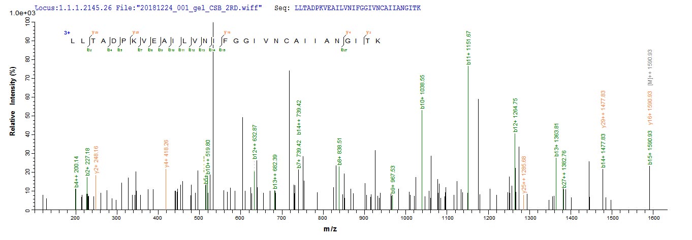 Based on the SEQUEST from database of E.coli host and target protein, the LC-MS/MS Analysis result of CSB-EP846636HU could indicate that this peptide derived from E.coli-expressed Homo sapiens (Human) SUCLG2.