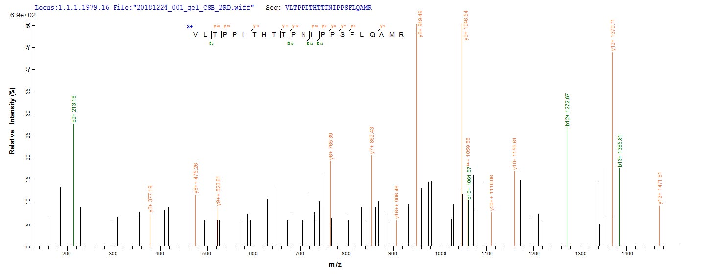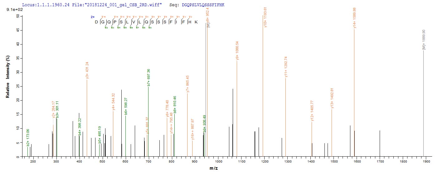 Based on the SEQUEST from database of E.coli host and target protein, the LC-MS/MS Analysis result of CSB-EP361045HQJ could indicate that this peptide derived from E.coli-expressed Human T-cell leukemia virus 1 (strain Japan ATK-1 subtype A) (HTLV-1) tax.