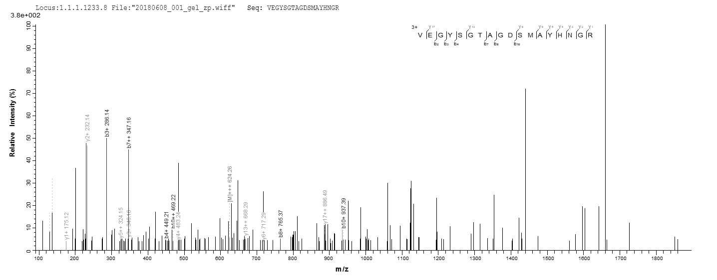 Based on the SEQUEST from database of E.coli host and target protein, the LC-MS/MS Analysis result of CSB-RP115094h(C) could indicate that this peptide derived from E.coli-expressed Homo sapiens (Human) TNC.