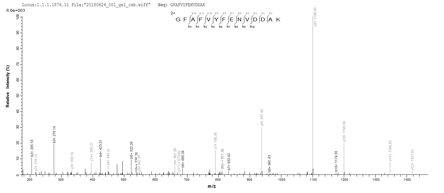 Based on the SEQUEST from database of E.coli host and target protein, the LC-MS/MS Analysis result of CSB-EP021143HU1 could indicate that this peptide derived from E.coli-expressed Homo sapiens (Human) TRA2B.