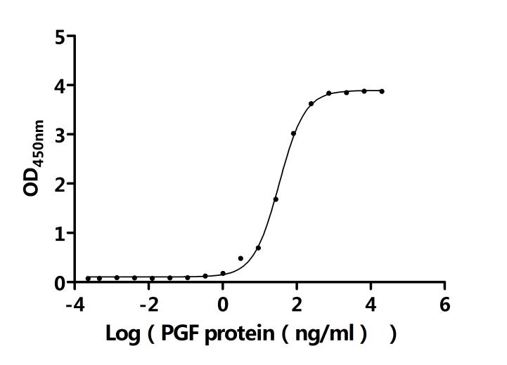 Measured by its binding ability in a functional ELISA. Immobilized Human FLT1 protein at 2 μg/ml can bind Human PGF (CSB-MP017854HU) protein. The EC50 is 31.39-36.32 ng/mL. Biological Activity Assay