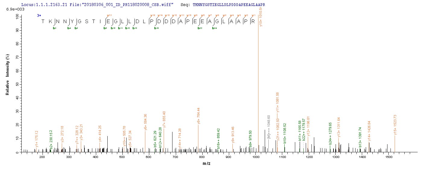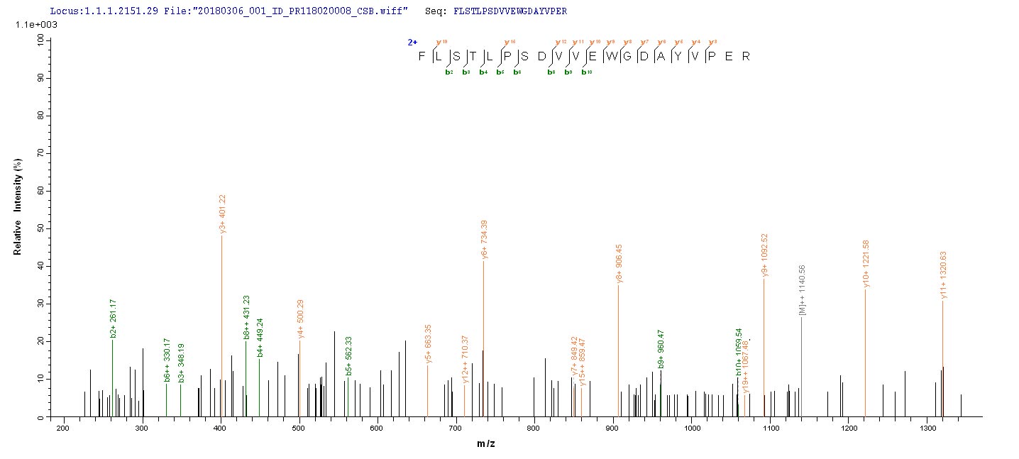 Based on the SEQUEST from database of E.coli host and target protein, the LC-MS/MS Analysis result of CSB-EP356268HWZ could indicate that this peptide derived from E.coli-expressed Human herpesvirus 1 (strain F) (HHV-1) (Human herpes simplex virus 1) UL48.