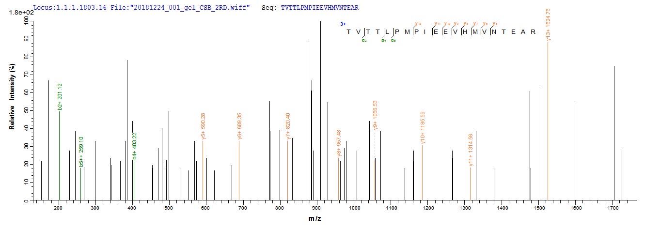 Based on the SEQUEST from database of E.coli host and target protein, the LC-MS/MS Analysis result of CSB-EP346747HKB1 could indicate that this peptide derived from E.coli-expressed Human herpesvirus 7 (strain JI) (HHV-7) (Human T lymphotropic virus) gB.