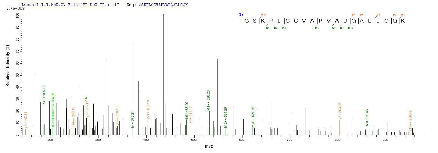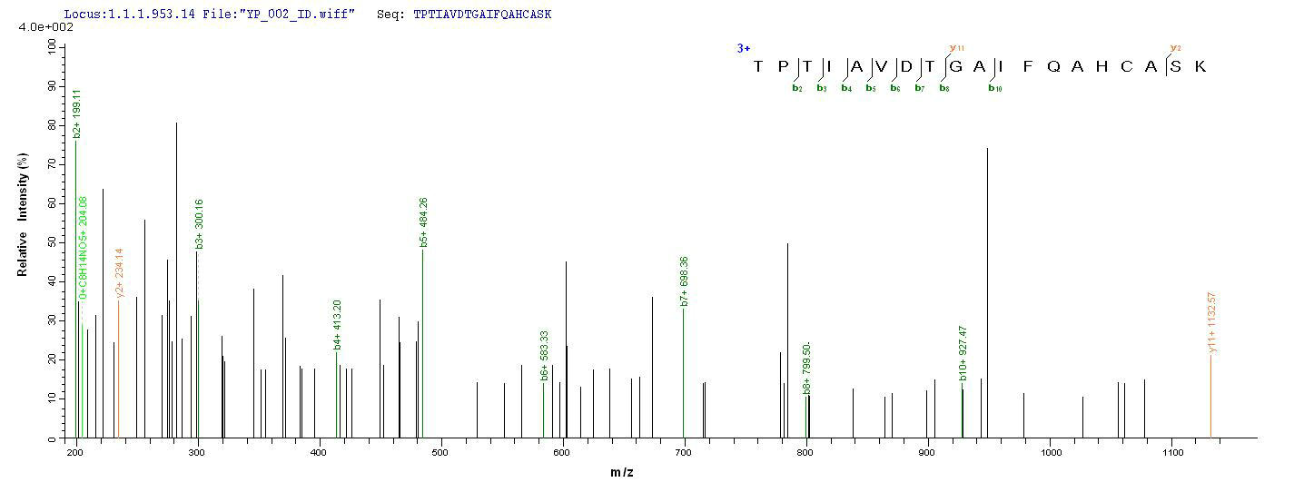 Based on the SEQUEST from database of Yeast host and target protein, the LC-MS/MS Analysis result of CSB-YP304437HYE could indicate that this peptide derived from Yeast-expressed Hypocrea jecorina (Trichoderma reesei) hfb2.