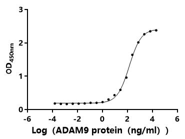 Measured by its binding ability in a functional ELISA.Immobilized Anti-ADAM9 recombinant antibody(CSB-RA618774MA1HU) at 2 μg/ml can bind Macaca fascicularis ADAM9.The EC50 is 114.4-171.1 ng/mL. Biological Activity Assay