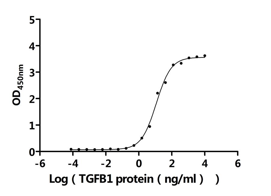 Measured by its binding ability in a functional ELISA. Immobilized Macaca fascicularis ITGAV&ITGB6 at 2 μg/ml can bind Macaca mulatta TGFB1 (CSB-MP6752MOW(A4)(M)). The EC50 is 8.899-14.82 ng/mL. Biological Activity Assay -