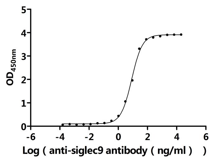 Measured by its binding ability in a functional ELISA.Immobilized Macaca fascicularis SIGLEC9 at 2 μg/ml can bind anti-SIGLEC9 recombinant antibody(CSB-RA021303MA2HU).The EC50 is 7.698-8.925 ng/mL. Biological Activity Assay -