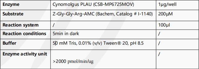 Fully active measured by its ability to cleave a peptide substrate, N-carbobenzyloxy-Gly-Gly-Arg-7-amido-4-methylcoumarin (Z-GGR-AMC). PLAU needs to be activated by Plasmin to be enzymatically active. The specific activity is > 2000 pmol/min/ug. Biological Activity Assay