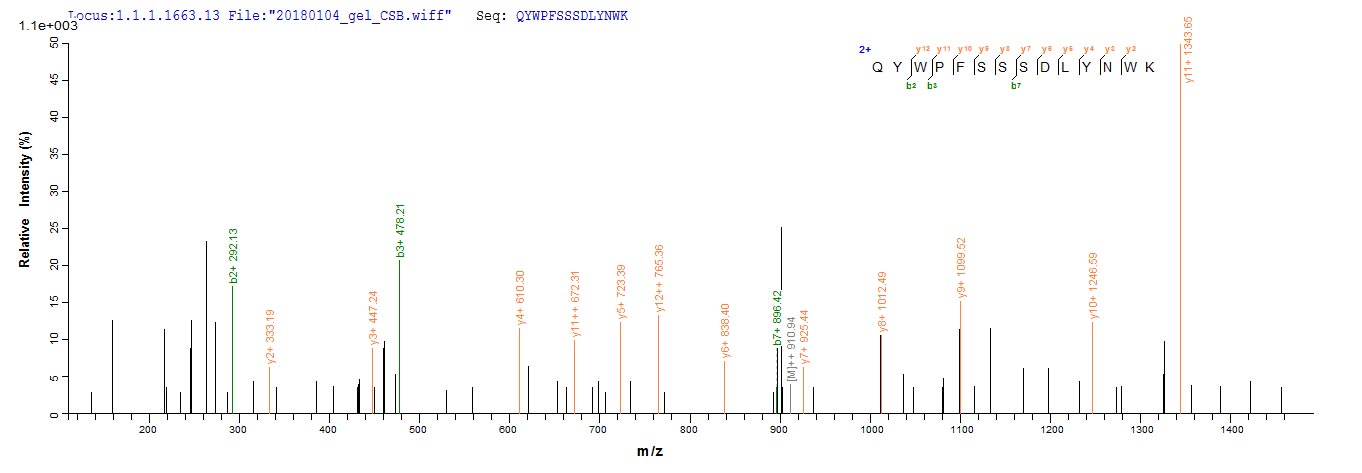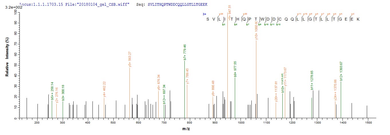 Based on the SEQUEST from database of E.coli host and target protein, the LC-MS/MS Analysis result of CSB-EP356017MHKe0 could indicate that this peptide derived from E.coli-expressed Moloney murine leukemia virus (isolate Shinnick) (MoMLV) gag.