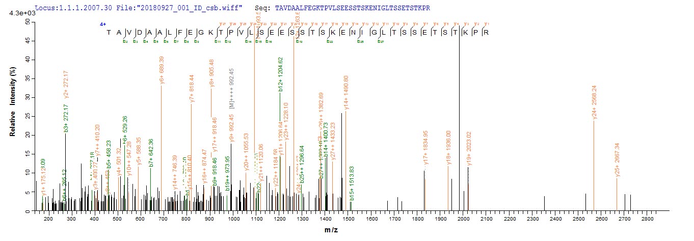 Based on the SEQUEST from database of Yeast host and target protein, the LC-MS/MS Analysis result of CSB-YP322675MHZ could indicate that this peptide derived from Yeast-expressed Moraxella bovis N/A.