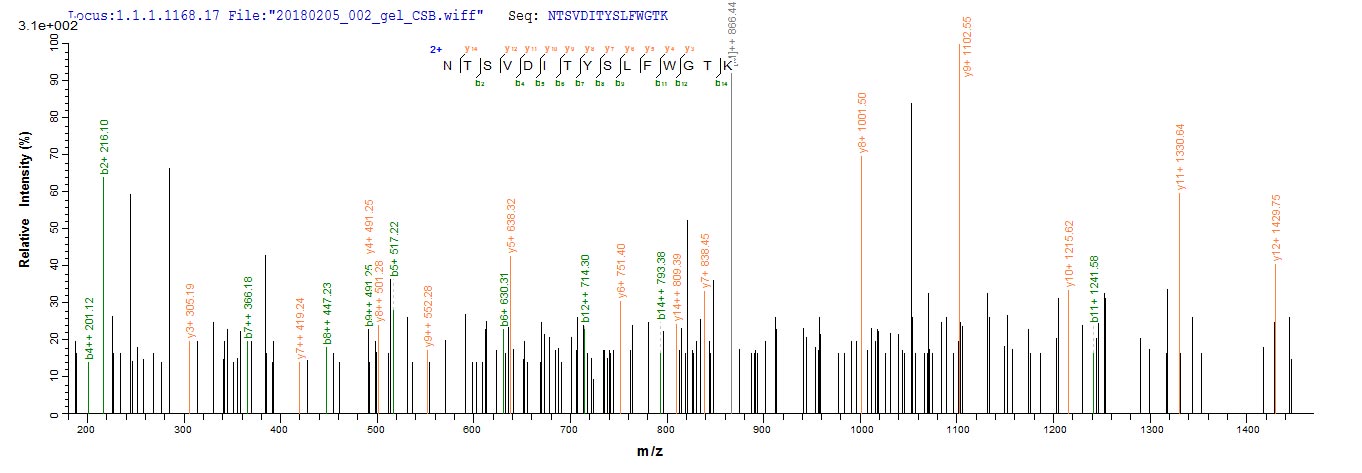 Based on the SEQUEST from database of E.coli host and target protein, the LC-MS/MS Analysis result of CSB-EP662302MO could indicate that this peptide derived from E.coli-expressed Mus musculus (Mouse) Milr1.
