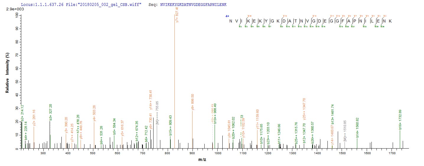 Based on the SEQUEST from database of E.coli host and target protein, the LC-MS/MS Analysis result of CSB-EP007670MOb0 could indicate that this peptide derived from E.coli-expressed Mus musculus (Mouse) Eno1.