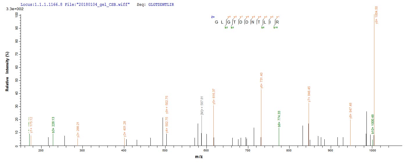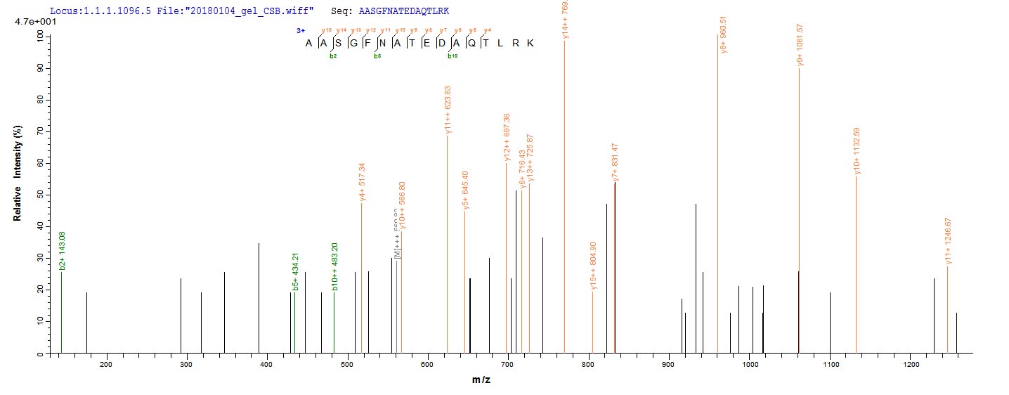Based on the SEQUEST from database of E.coli host and target protein, the LC-MS/MS Analysis result of CSB-EP001845MO could indicate that this peptide derived from E.coli-expressed Mus musculus (Mouse) Anxa4.