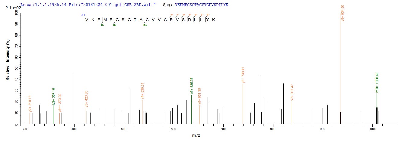 Based on the SEQUEST from database of E.coli host and target protein, the LC-MS/MS Analysis result of CSB-EP002600MO could indicate that this peptide derived from E.coli-expressed Mus musculus (Mouse) Bcat1.