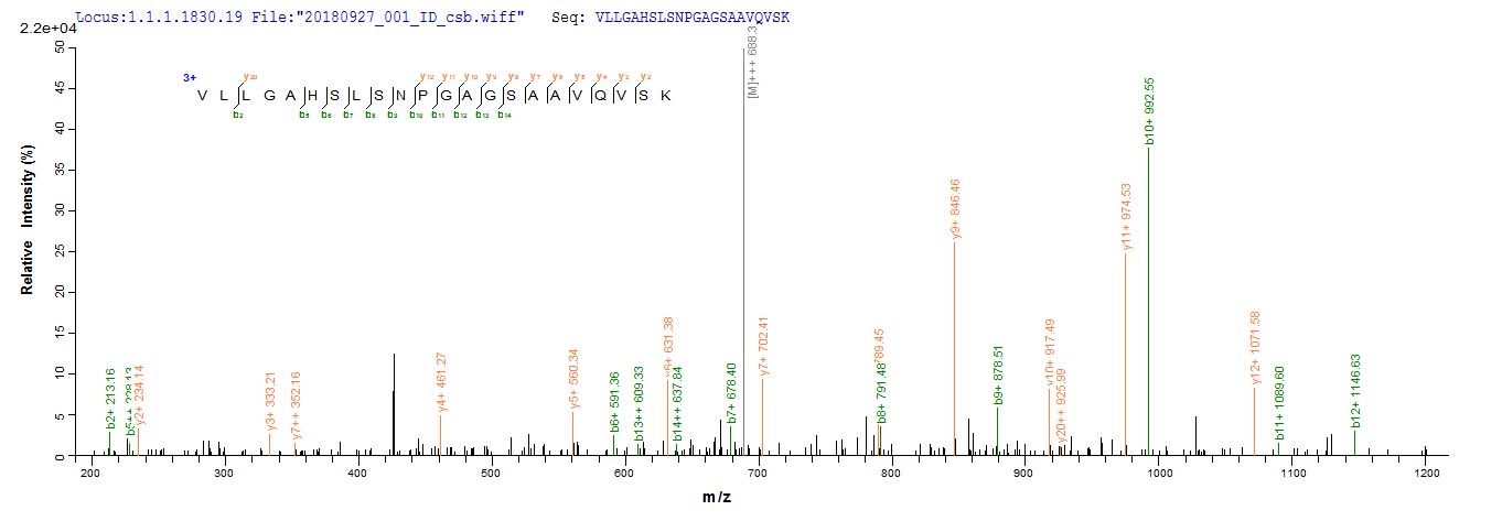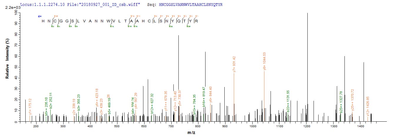 Based on the SEQUEST from database of E.coli host and target protein, the LC-MS/MS Analysis result of CSB-EP005196MO could indicate that this peptide derived from E.coli-expressed Mus musculus (Mouse) Cela2a.