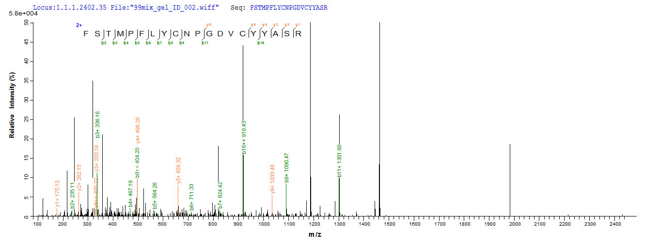 Based on the SEQUEST from database of E.coli host and target protein, the LC-MS/MS Analysis result of CSB-EP005742MO could indicate that this peptide derived from E.coli-expressed Mus musculus (Mouse) Col4a2.