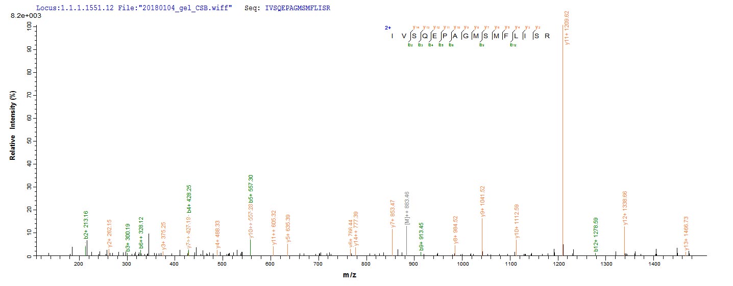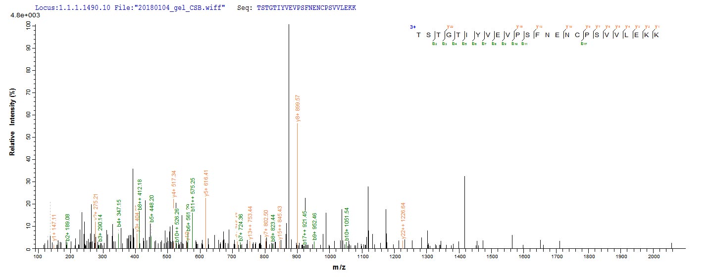 Based on the SEQUEST from database of E.coli host and target protein, the LC-MS/MS Analysis result of CSB-EP007205MO could indicate that this peptide derived from E.coli-expressed Mus musculus (Mouse) Dsg3.