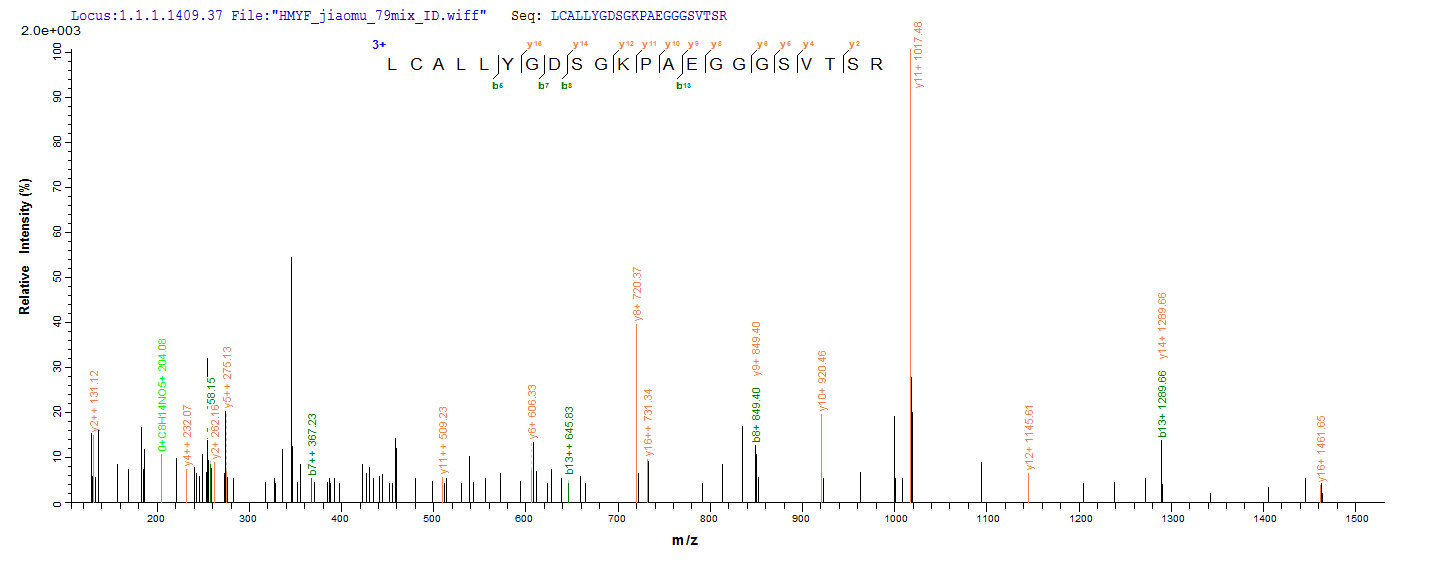 Based on the SEQUEST from database of E.coli host and target protein, the LC-MS/MS Analysis result of CSB-EP009160MO could indicate that this peptide derived from E.coli-expressed Mus musculus (Mouse) Gad2.