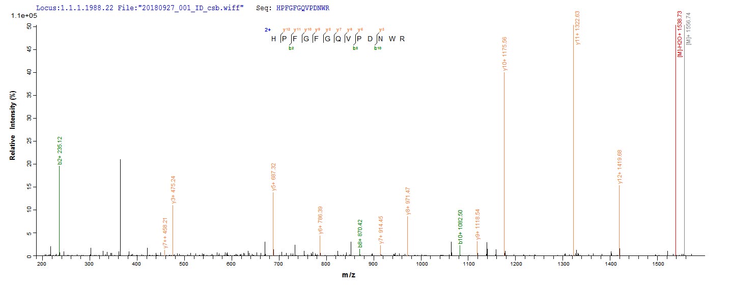 Based on the SEQUEST from database of E.coli host and target protein, the LC-MS/MS Analysis result of CSB-EP013040MO could indicate that this peptide derived from E.coli-expressed Mus musculus (Mouse) Loxl1.
