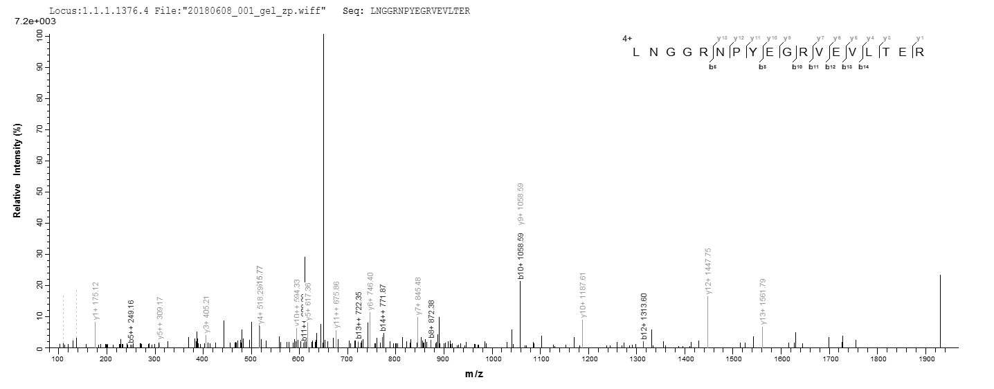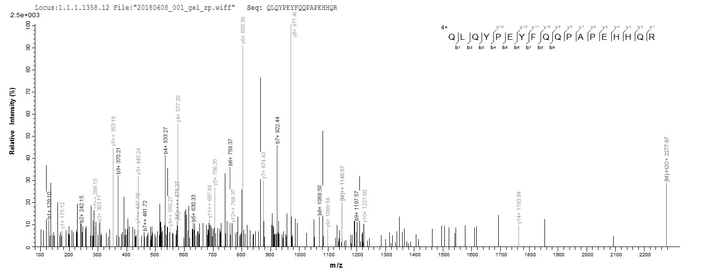 Based on the SEQUEST from database of E.coli host and target protein, the LC-MS/MS Analysis result of CSB-EP013041MO could indicate that this peptide derived from E.coli-expressed Mus musculus (Mouse) Loxl2.