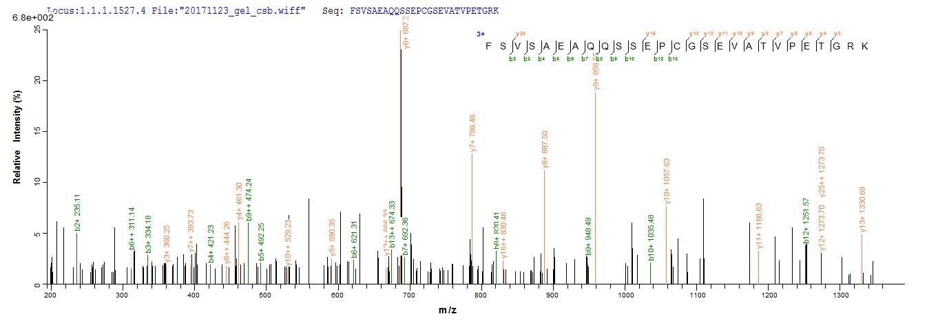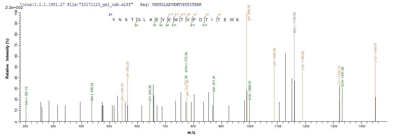 Based on the SEQUEST from database of E.coli host and target protein, the LC-MS/MS Analysis result of CSB-EP328826MO could indicate that this peptide derived from E.coli-expressed Mus musculus (Mouse) Mug1.