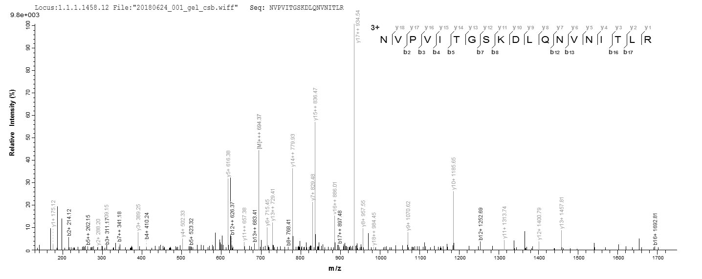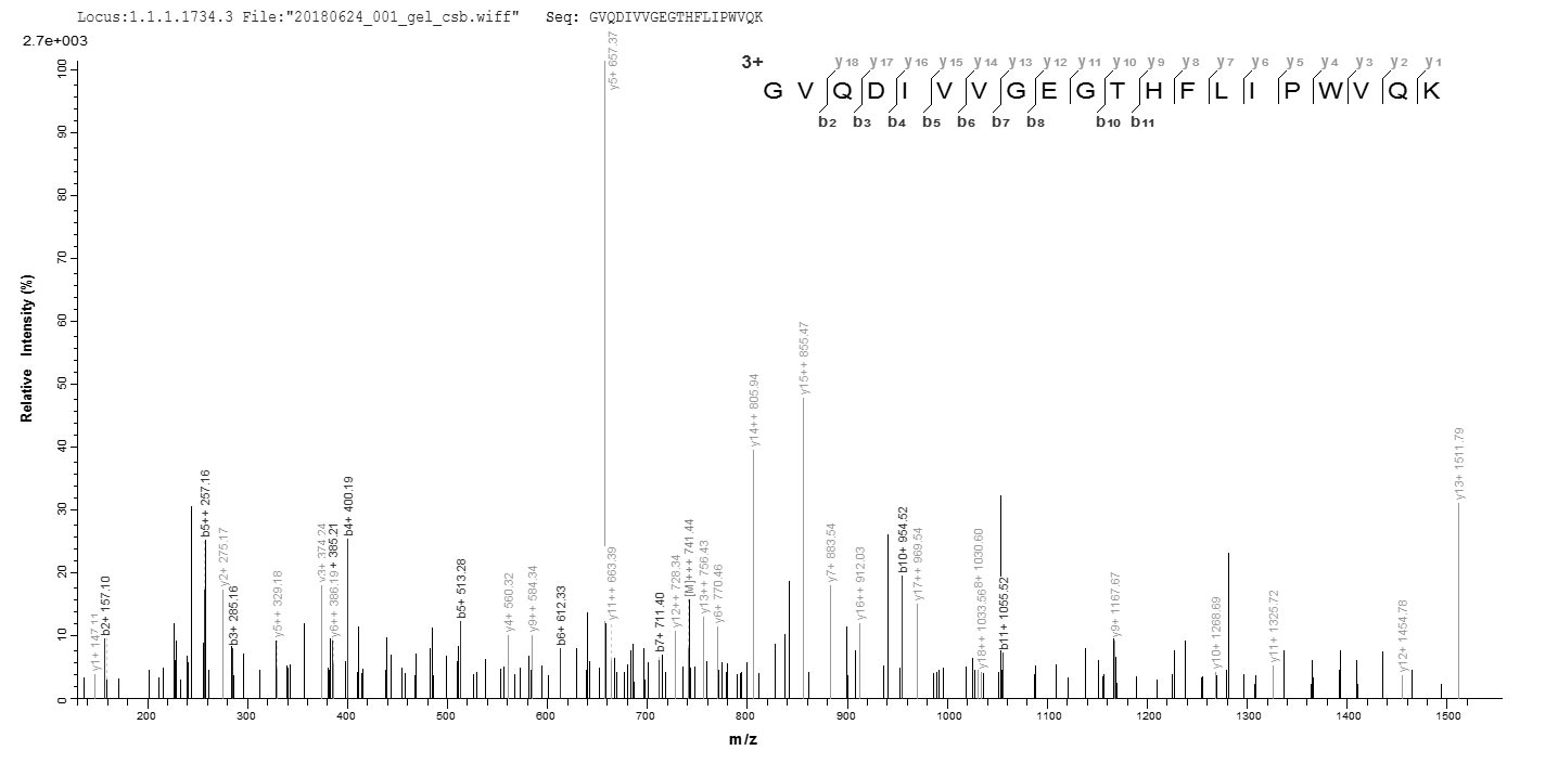 Based on the SEQUEST from database of E.coli host and target protein, the LC-MS/MS Analysis result of CSB-EP017885MO2 could indicate that this peptide derived from E.coli-expressed Mus musculus (Mouse) Phb.