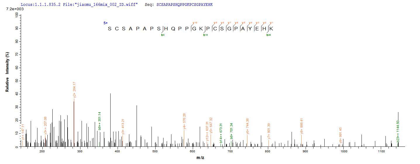 Based on the SEQUEST from database of Yeast host and target protein, the LC-MS/MS Analysis result of CSB-YP005291MO could indicate that this peptide derived from Yeast-expressed Mus musculus (Mouse) Cfp.