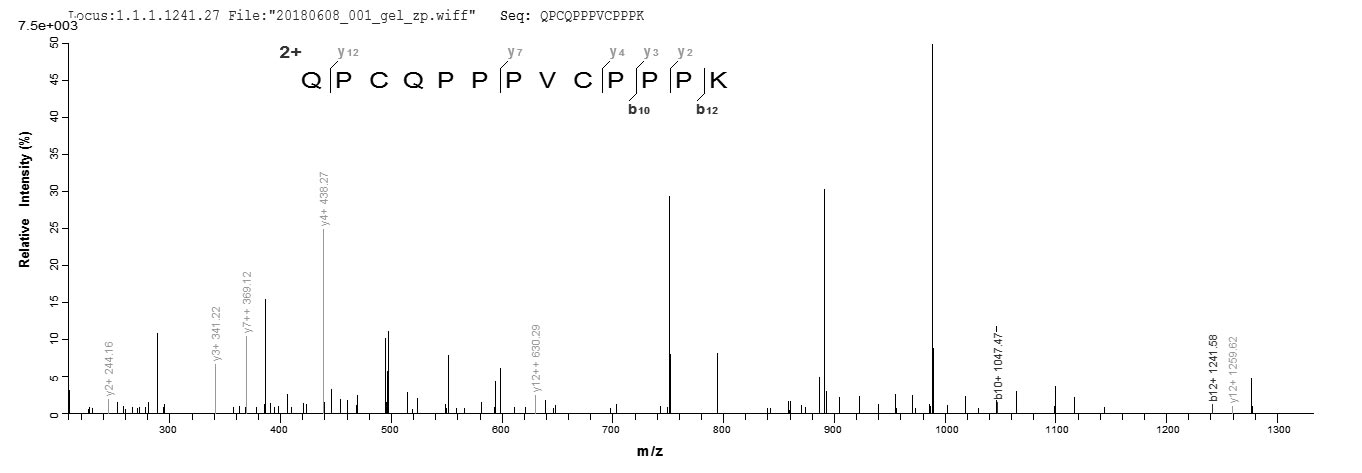 Based on the SEQUEST from database of E.coli host and target protein, the LC-MS/MS Analysis result of CSB-EP022613MO could indicate that this peptide derived from E.coli-expressed Mus musculus (Mouse) Sprr2b.