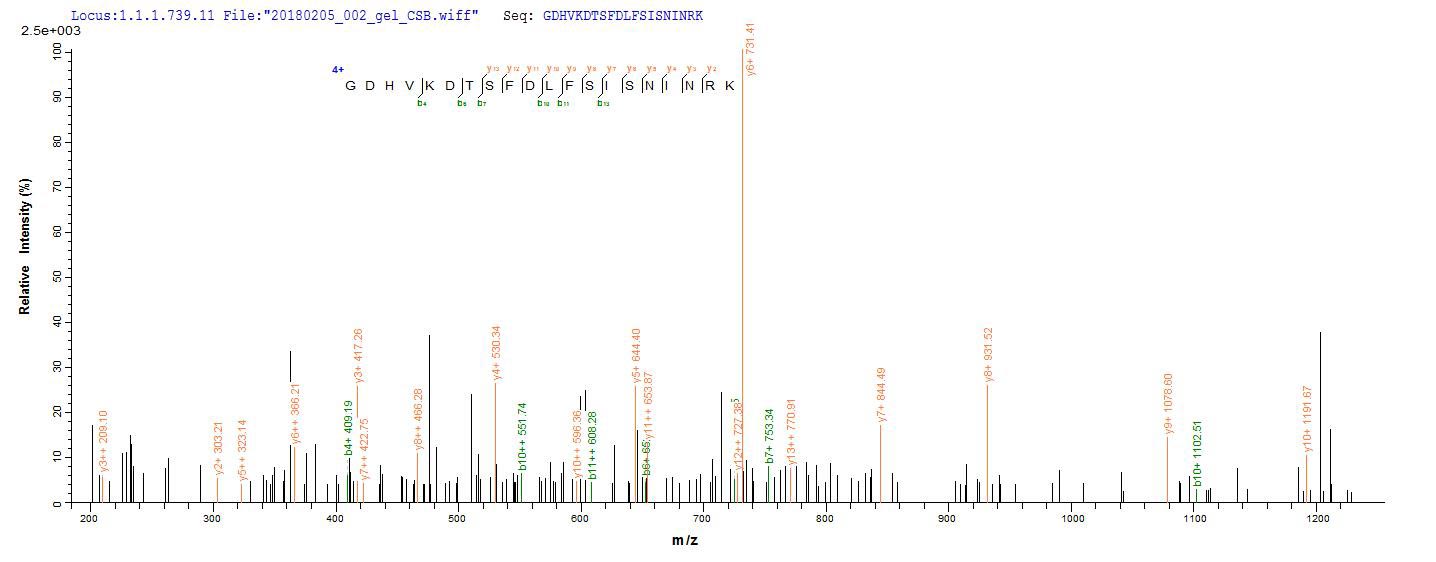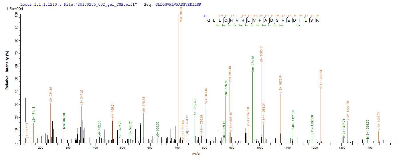 Based on the SEQUEST from database of E.coli host and target protein, the LC-MS/MS Analysis result of CSB-EP023488MO could indicate that this peptide derived from E.coli-expressed Mus musculus (Mouse) Thbs2.
