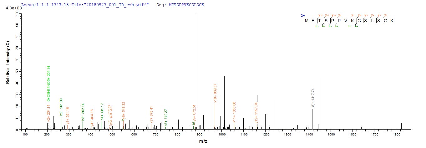 Based on the SEQUEST from database of E.coli host and target protein, the LC-MS/MS Analysis result of CSB-EP720284MO could indicate that this peptide derived from E.coli-expressed Mus musculus (Mouse) Vcan.