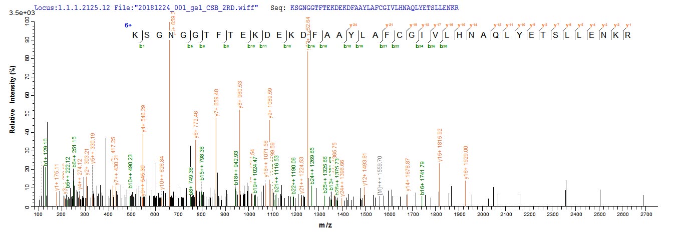 Based on the SEQUEST from database of E.coli host and target protein, the LC-MS/MS Analysis result of CSB-EP807017MO could indicate that this peptide derived from E.coli-expressed Mus musculus (Mouse) Pde5a.
