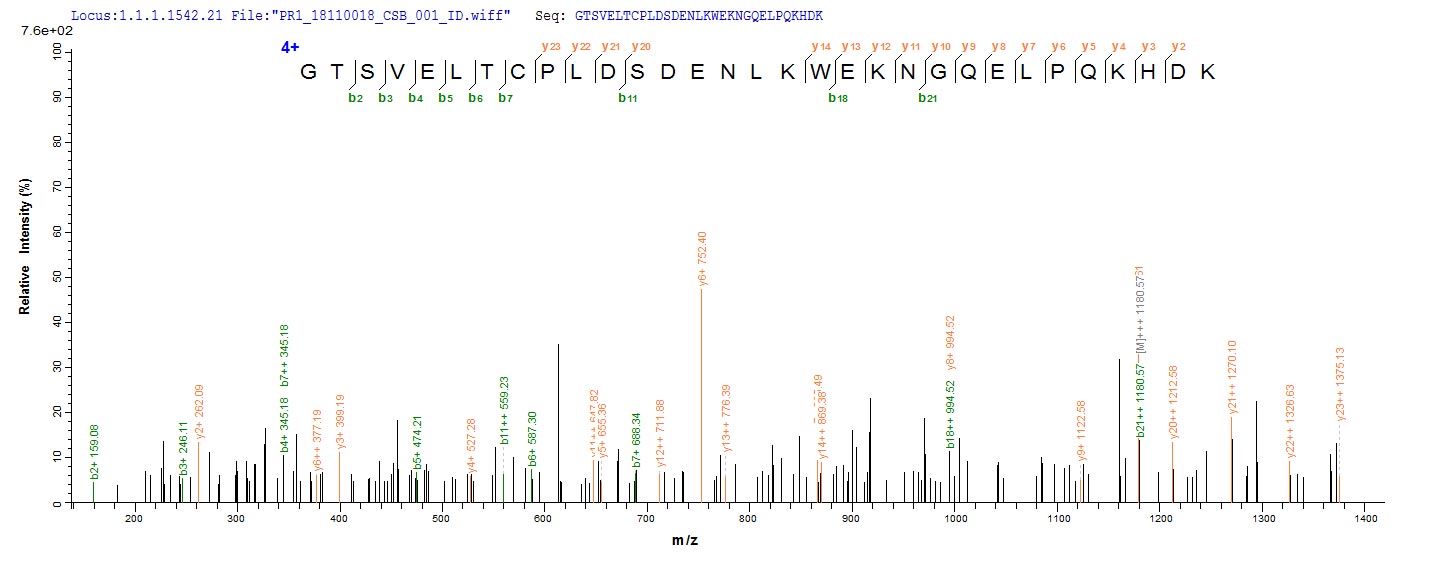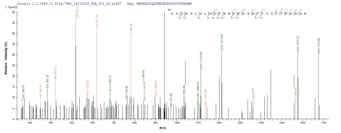 Based on the SEQUEST from database of Yeast host and target protein, the LC-MS/MS Analysis result of CSB-YP004931MO could indicate that this peptide derived from Yeast-expressed Mus musculus (Mouse) Cd3e.