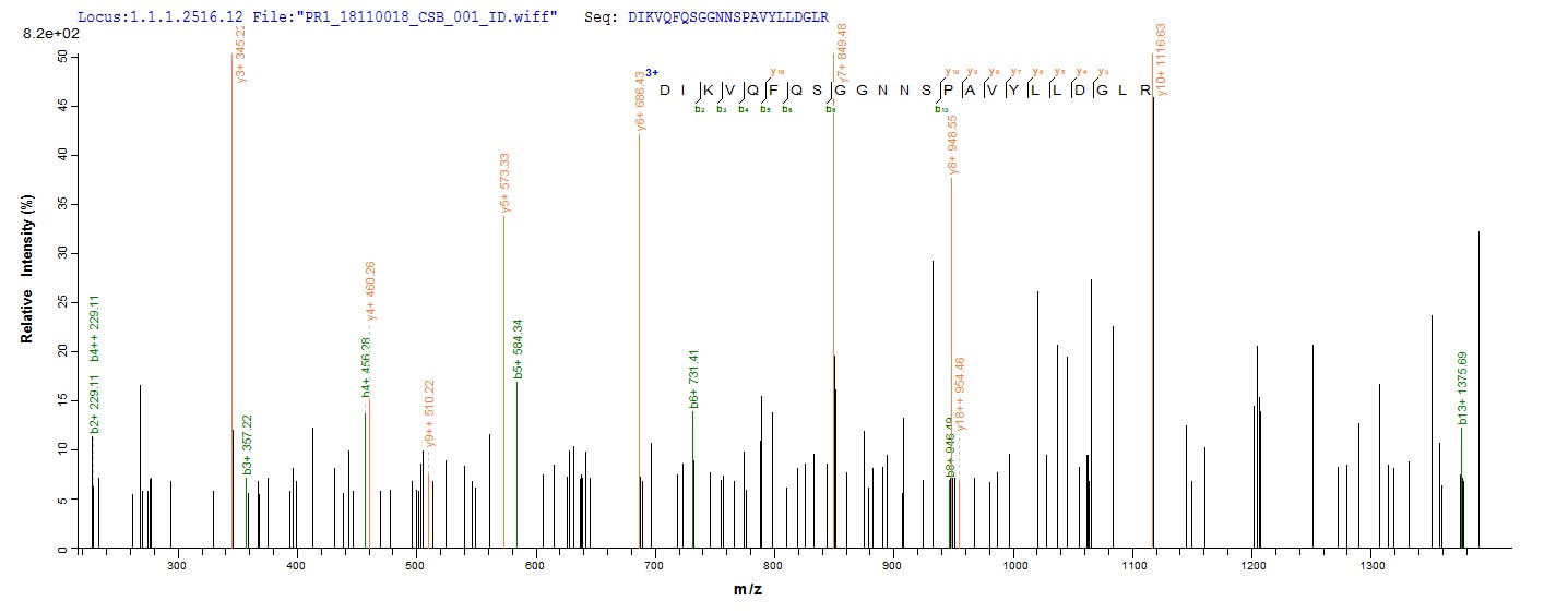 Based on the SEQUEST from database of Yeast host and target protein, the LC-MS/MS Analysis result of CSB-YP314366MVZ could indicate that this peptide derived from Yeast-expressed Mycobacterium tuberculosis (strain CDC 1551 / Oshkosh) fbpB.