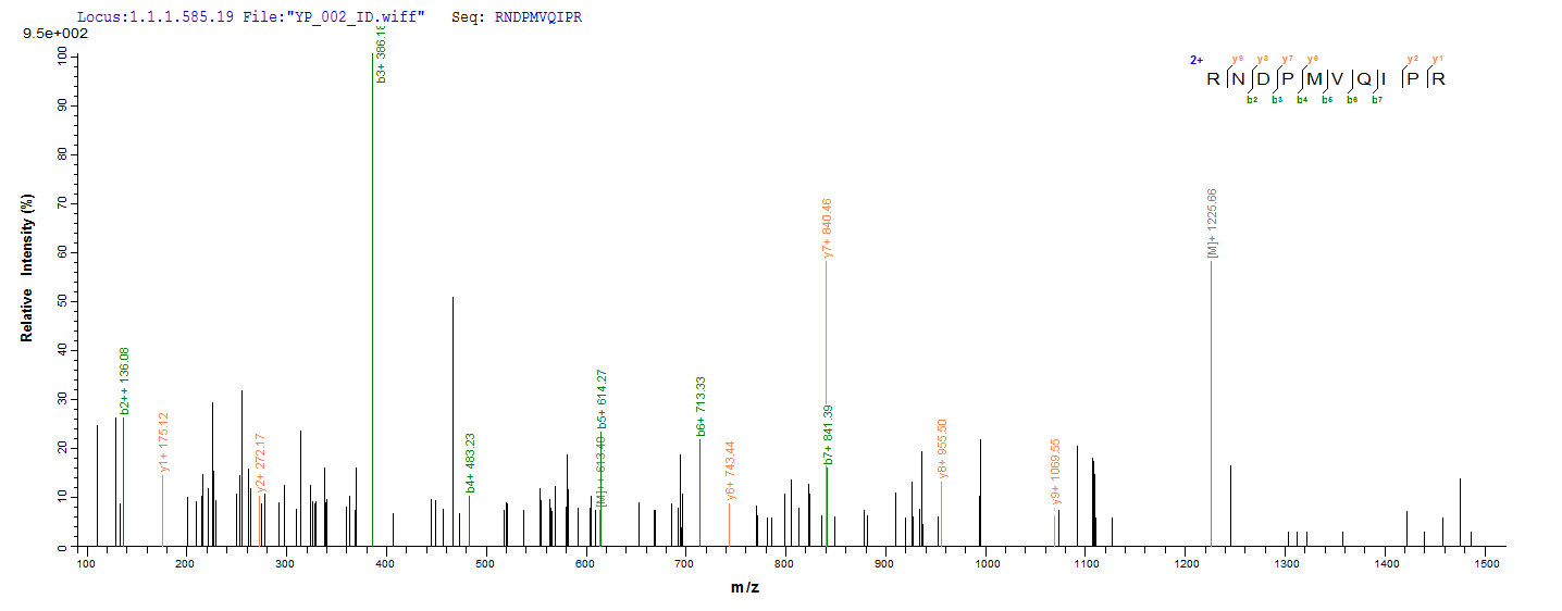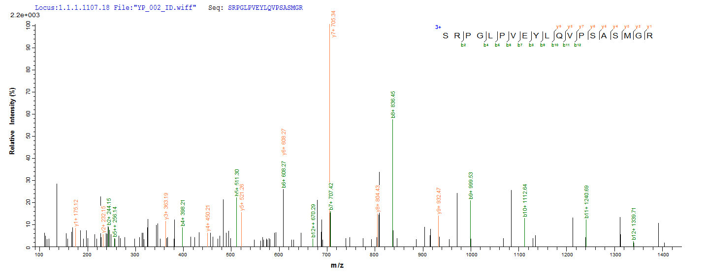 Based on the SEQUEST from database of E.coli host and target protein, the LC-MS/MS Analysis result of CSB-EP363614MVZ could indicate that this peptide derived from E.coli-expressed Mycobacterium tuberculosis (strain CDC 1551 / Oshkosh) fbpC.