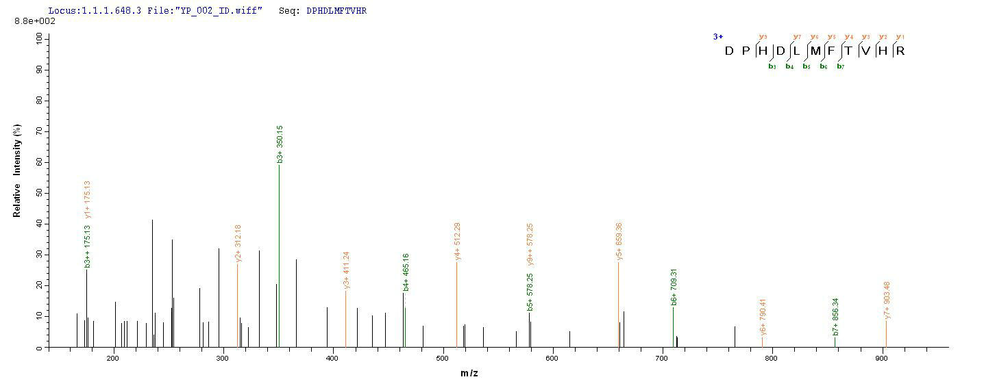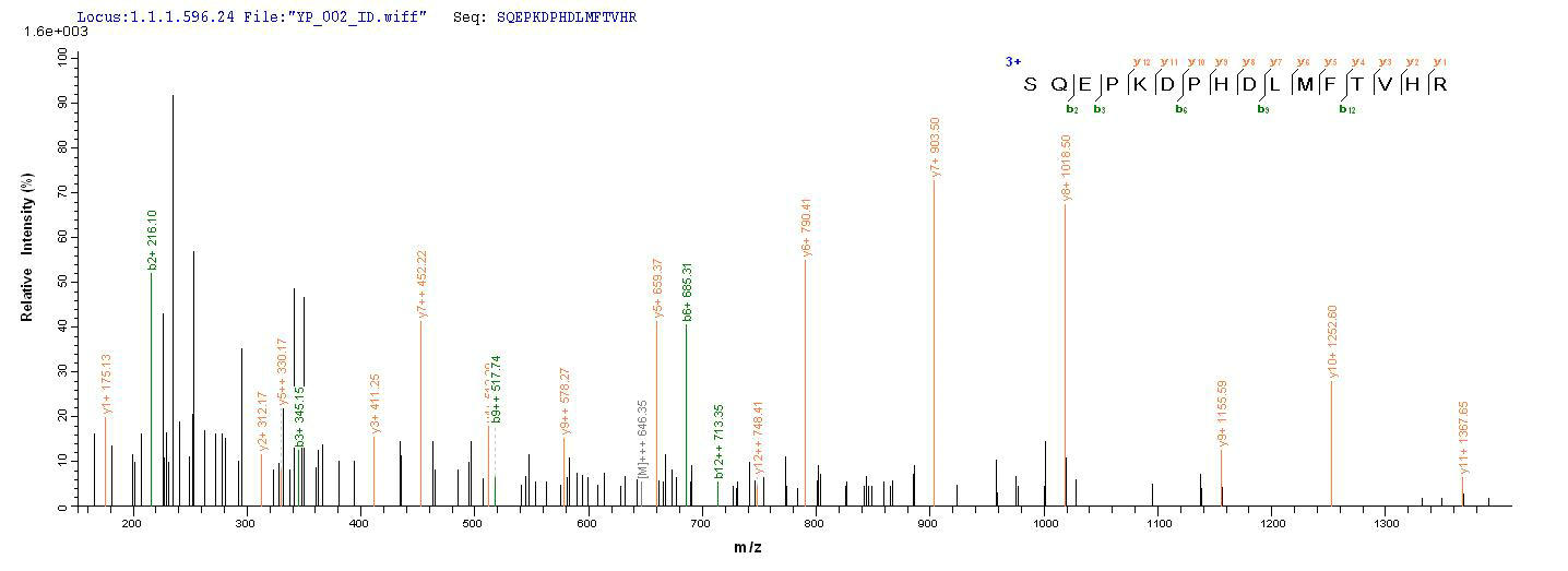 Based on the SEQUEST from database of Yeast host and target protein, the LC-MS/MS Analysis result of CSB-YP005052PI could indicate that this peptide derived from Yeast-expressed Sus scrofa (Pig) CDH3.