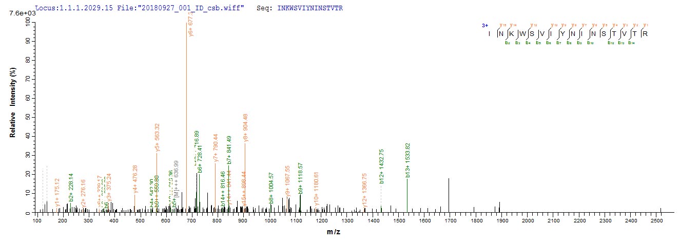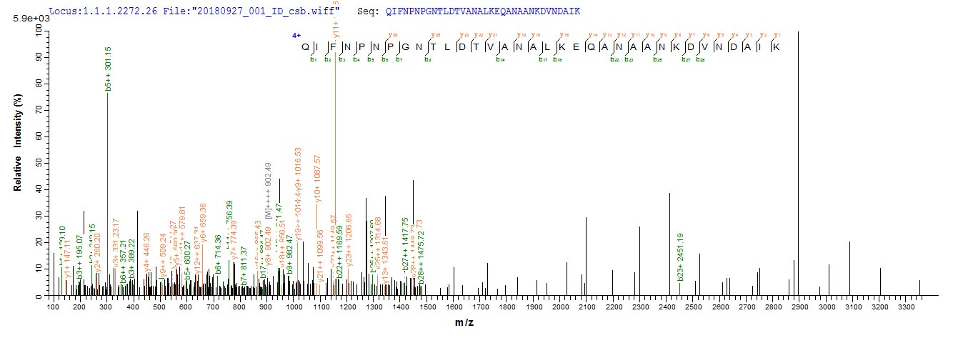 Based on the SEQUEST from database of E.coli host and target protein, the LC-MS/MS Analysis result of CSB-EP310982EZX could indicate that this peptide derived from E.coli-expressed Pseudomonas aeruginosa (strain ATCC 15692 / DSM 22644 / CIP 104116 / JCM 14847 / LMG 12228 / 1C / PRS 101 / PAO1) pscF.