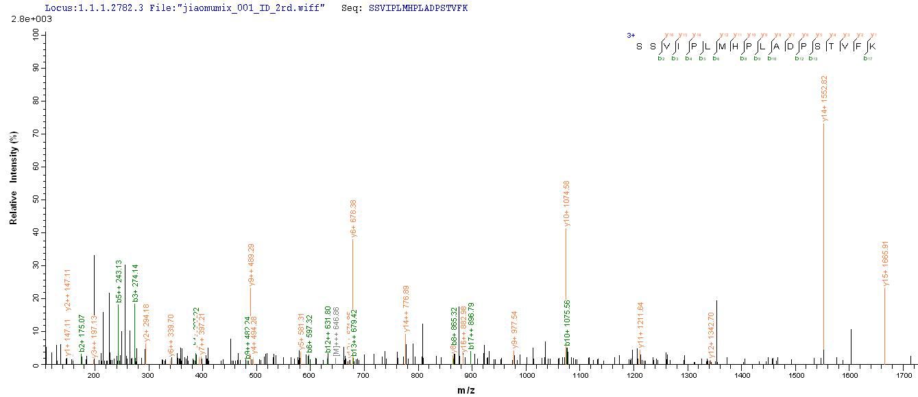 Based on the SEQUEST from database of E.coli host and target protein, the LC-MS/MS Analysis result of CSB-EP526040RJA could indicate that this peptide derived from E.coli-expressed Rabies virus (strain CVS-11) (RABV) G.