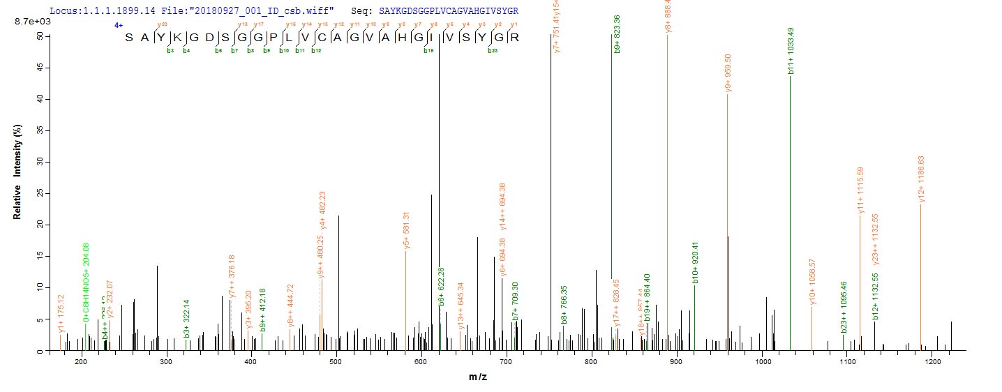 Based on the SEQUEST from database of E.coli host and target protein, the LC-MS/MS Analysis result of CSB-EP357723RA could indicate that this peptide derived from E.coli-expressed Rattus norvegicus (Rat) Mcpt1.