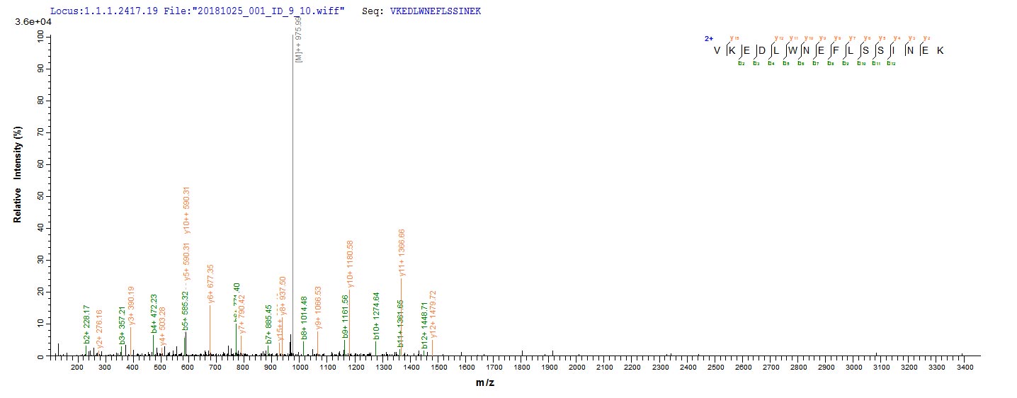 Based on the SEQUEST from database of Yeast host and target protein, the LC-MS/MS Analysis result of CSB-YP330827SVG could indicate that this peptide derived from Yeast-expressed Saccharomyces cerevisiae (strain ATCC 204508 / S288c) (Baker's yeast) ECM31.
